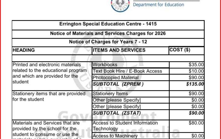 Finance & Fees Families are required to pay an annual Materials and Services fee each child enrolled at Errington Special Education...