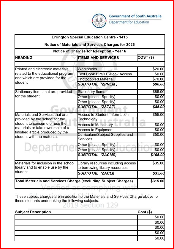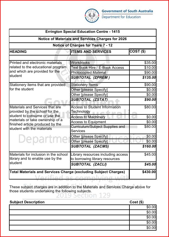 Families are required to pay an annual Materials and Services fee each child enrolled at Errington Special Education Centre.
